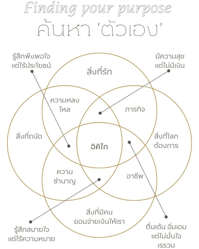 ถึงตรงนี้ คุณตอบตัวเองได้หรือยังว่า “อะไรคือสิ่งที่คุณรัก สิ่งที่คุณทำได้ดี สิ่งที่สร้างรายได้ และสิ่งที่สังคมต้องการ” หากยังไม่พบ ❝ อิคิไก ❞ ลองทำตามวิธีง่าย ๆ จาก ‘The Little Book of Ikigai’ โดย Ken Mogi อาจช่วยให้คุณค้นพบคำตอบได้
