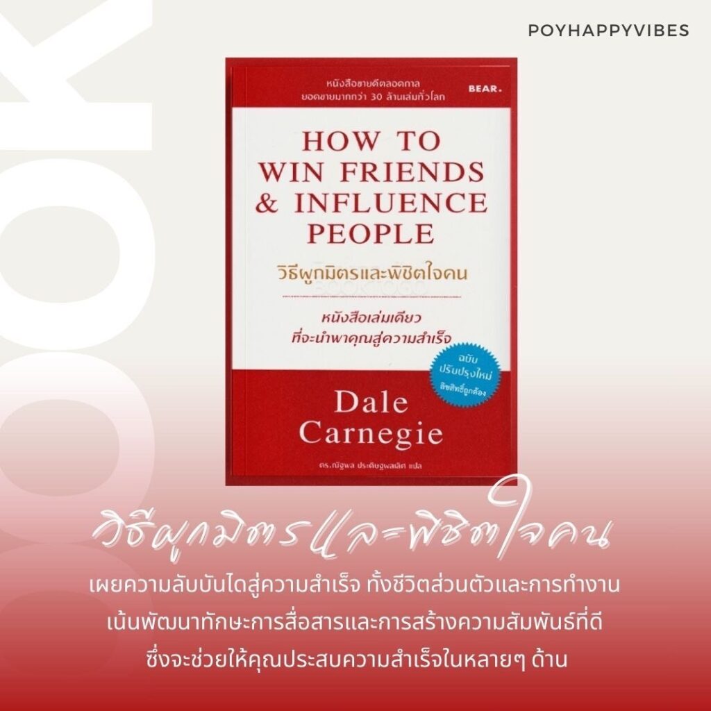 - เหตุผล: หนังสือเล่มนี้มุ่งเน้นการพัฒนาทักษะการสื่อสารและการสร้างความสัมพันธ์ที่ดี ซึ่งเป็นทักษะที่มีความสำคัญอย่างยิ่งในการทำงานและชีวิตส่วนตัว หนังสือจะเสนอวิธีการในการทำความเข้าใจและการสร้างความสัมพันธ์ที่ดีกับผู้อื่น ซึ่งจะช่วยให้คุณประสบความสำเร็จในหลาย ๆ ด้าน